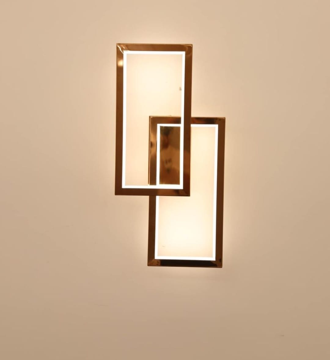 Aplique de parede, com 2 retângulos em led e acabamento dourado brilhante.