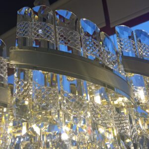 Finaliza com palas em vidro no topo com pormenor em aro oval dourado.