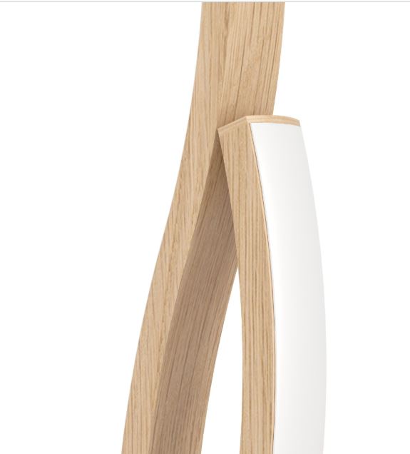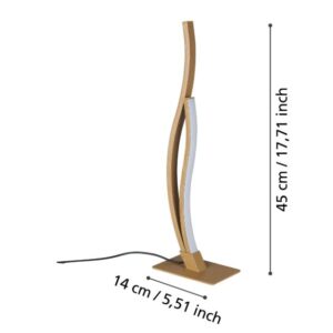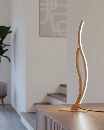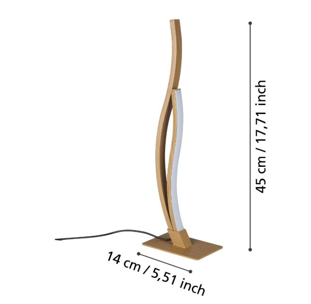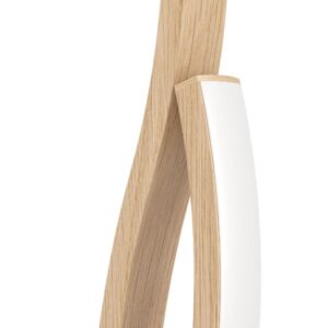 Candeeiro de mesa em acrílico branco e imitação madeira.