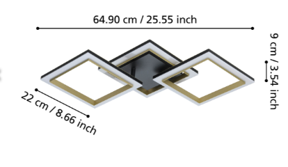 Candeeiro de teto em aço com formato de quadrados, com plástico preto e acabamento efeito latão.