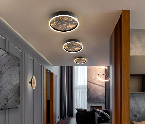 Difusor translúcido em ardósia multicolorida e aro em acrílico opalino.