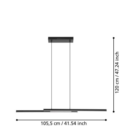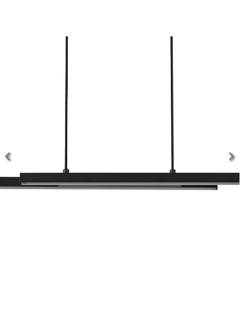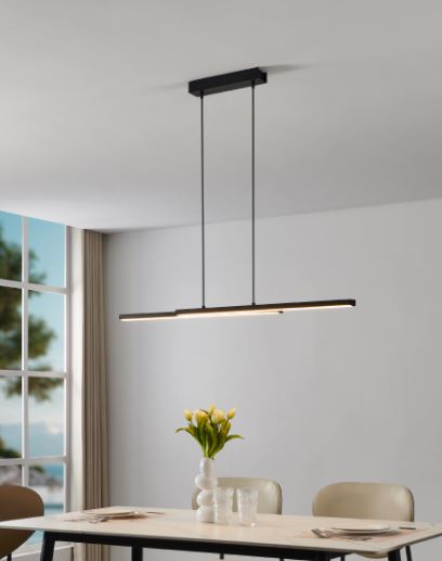 Suspensão de teto com design que apresenta dois longos elementos de luz feitos de alumínio de cor preto dispostos em paralelo e deslocados um do outro e LEDs integrados sob os difusores de luz de plástico branco com luz que pode ir desde branco quente, branco neutro e branco frio e uma vasta gama de cores RGB.