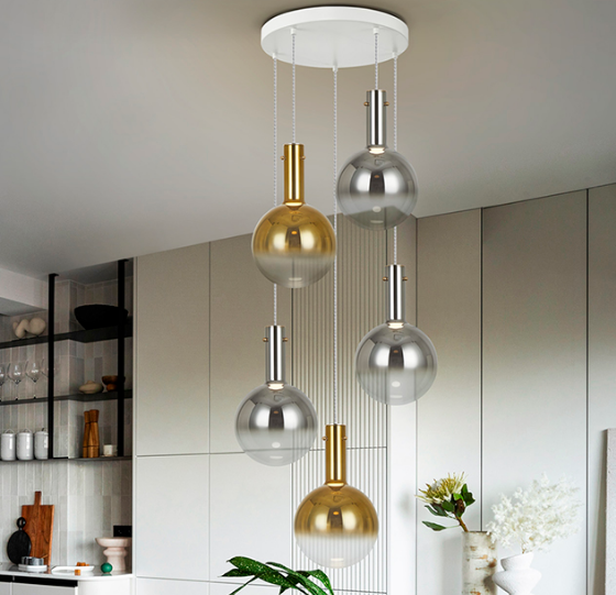 Abatjours de vidro soprado de Ø20 cm, cinzento smoke espelhado e dourado espelhado.
