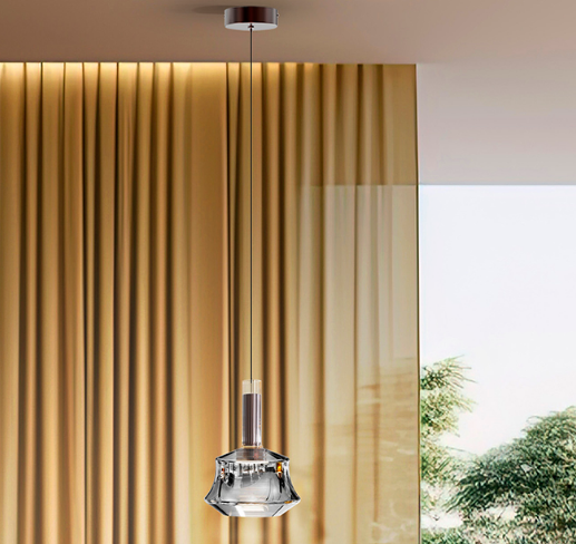 Abajur de vidro com banho eletrolítico em tom prateado, com luz LED e difusor em acrílico opalino.