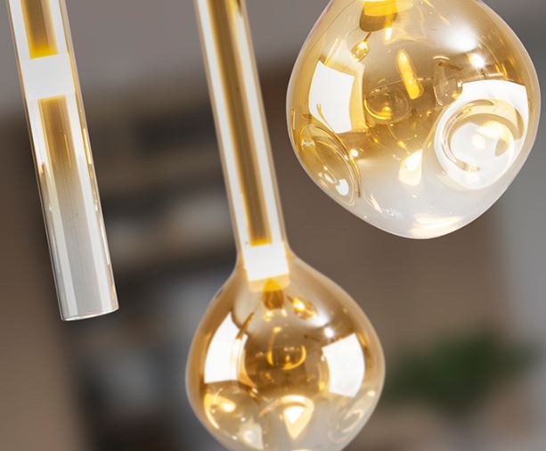 Candeeiro realizado em metal acabamento preto mate e dourado. 5 abajures de vidro âmbar degradê a transparente. Regulável em altura. 20W LED, 3000 K. 1.200 lm.